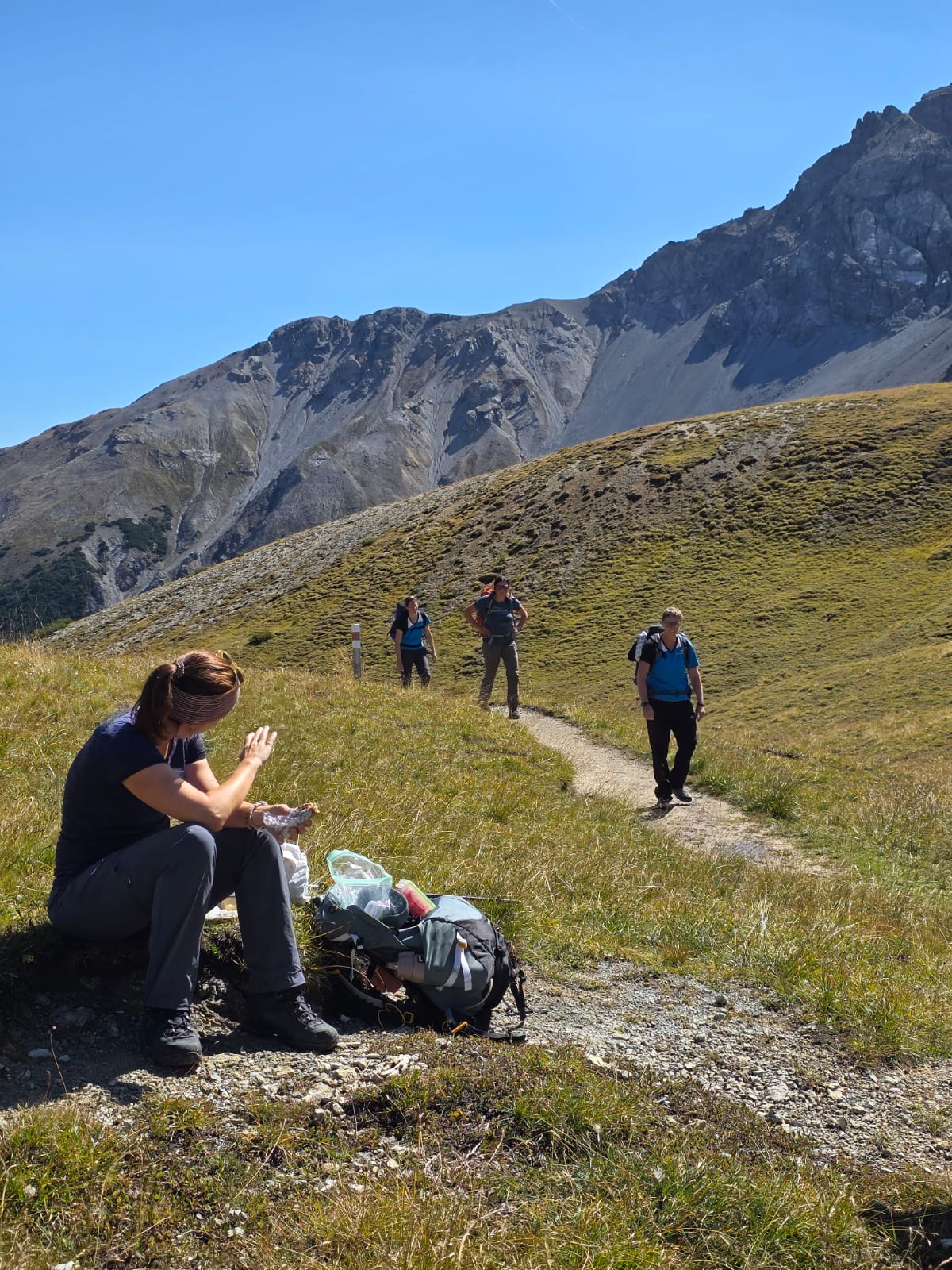 Ein Teil machte eine etwas grössere Tour von Val Minger über den Furcla Val Botch nach il Fuorn und die andere Gruppe wanderte von Chinuoschel Brail nach Zernez. Bei wunderschönstem Wetter genossen wir den Tag in der herrlichen Bergwelt im und um den Nationalpark. Am Abend trafen wir uns alle wieder im Hotel Baer und Post und quartierten uns in den drei 8-Bettzimmern ein, bevor wir das exzellente Abendessen im Hotel genossen und den Abend in lustiger Runde ausklingen liessen.