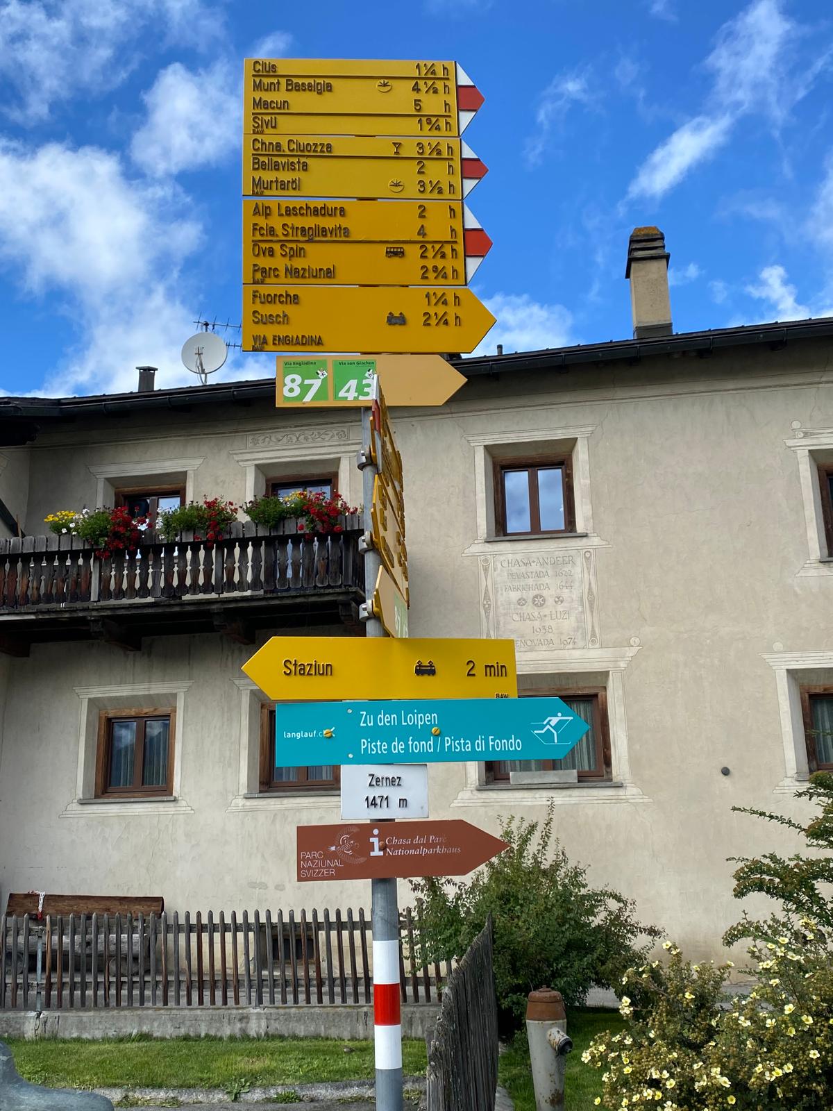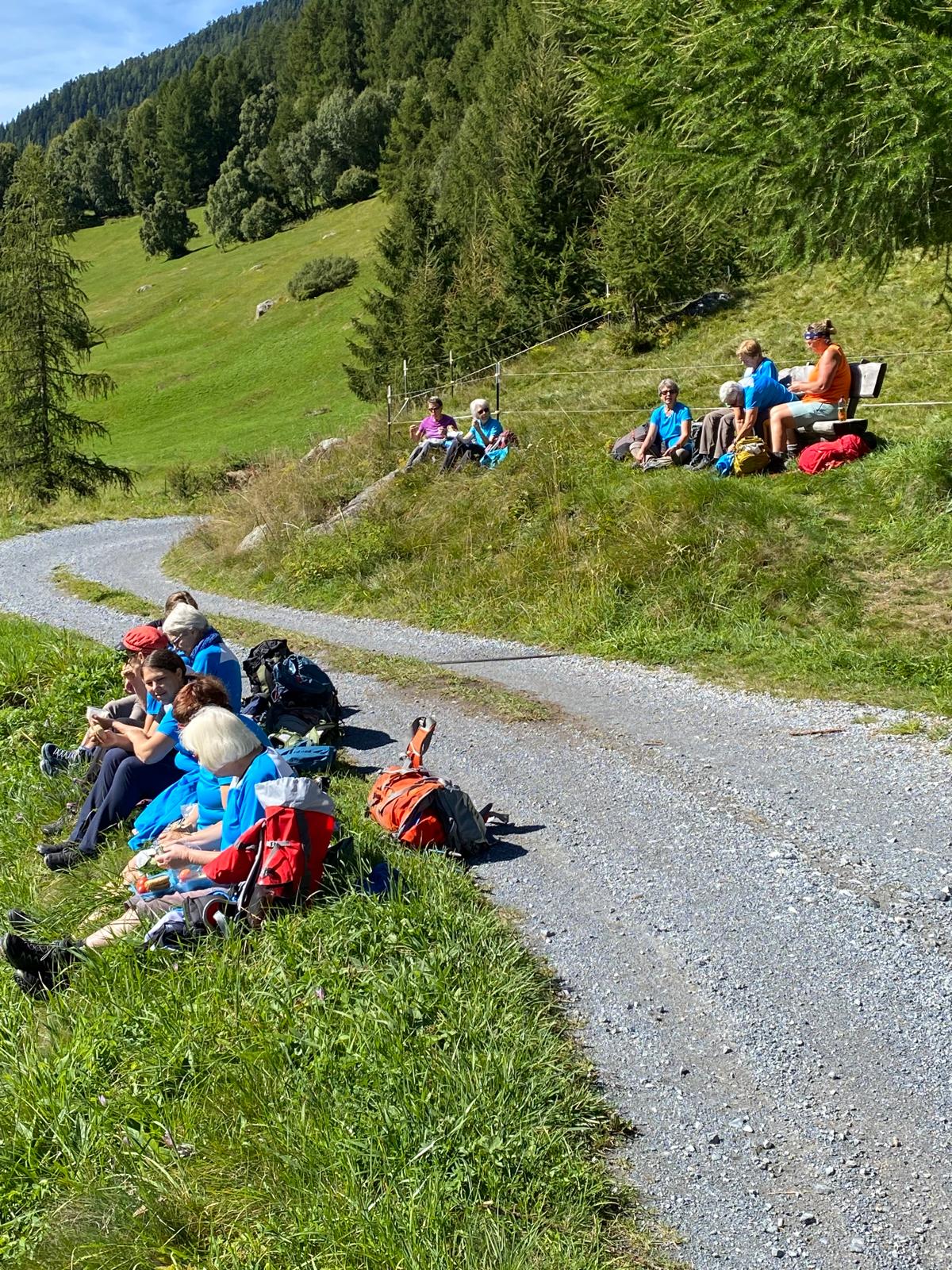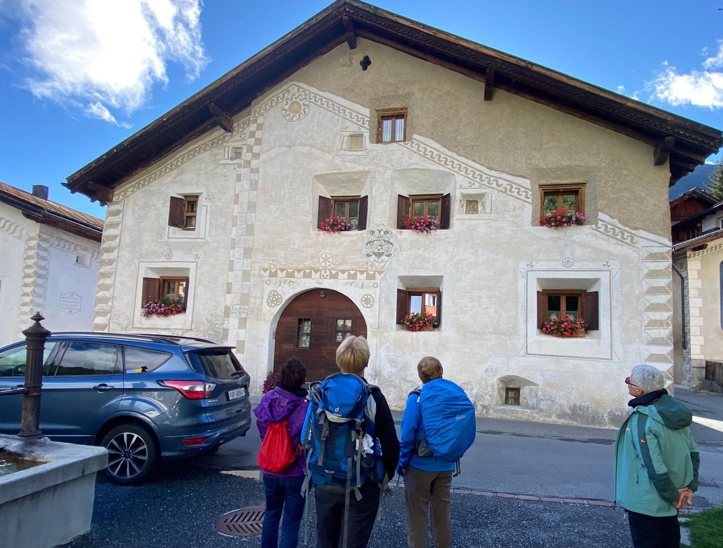 Nach einer mehr oder weniger erholsamen Nacht und einem köstlichen Frühstück im Hotel machten wir uns anschliessend, wiederum bei schönstem Wetter, mit Zug und Posti, alle gemeinsam auf den Weg nach Guarda cumün. Dort besichtigten wir das sehr sehenswerte Dörfchen mit seinen wunderschönen Engadiner-Häusern, seinen vielen Brunnen und dem kleinen Schellenursli Museum. Danach wanderten wir durch die schönen Gegenden über Lavin nach Susch, wo sich die meisten nach einem Kaffeehalt für die Rückfahrt nach Zernez im Zug entschieden. Eine kleine Gruppe wanderte auch den Rest der Strecke, dem wilden Inn entlang, nach Zernez zurück.